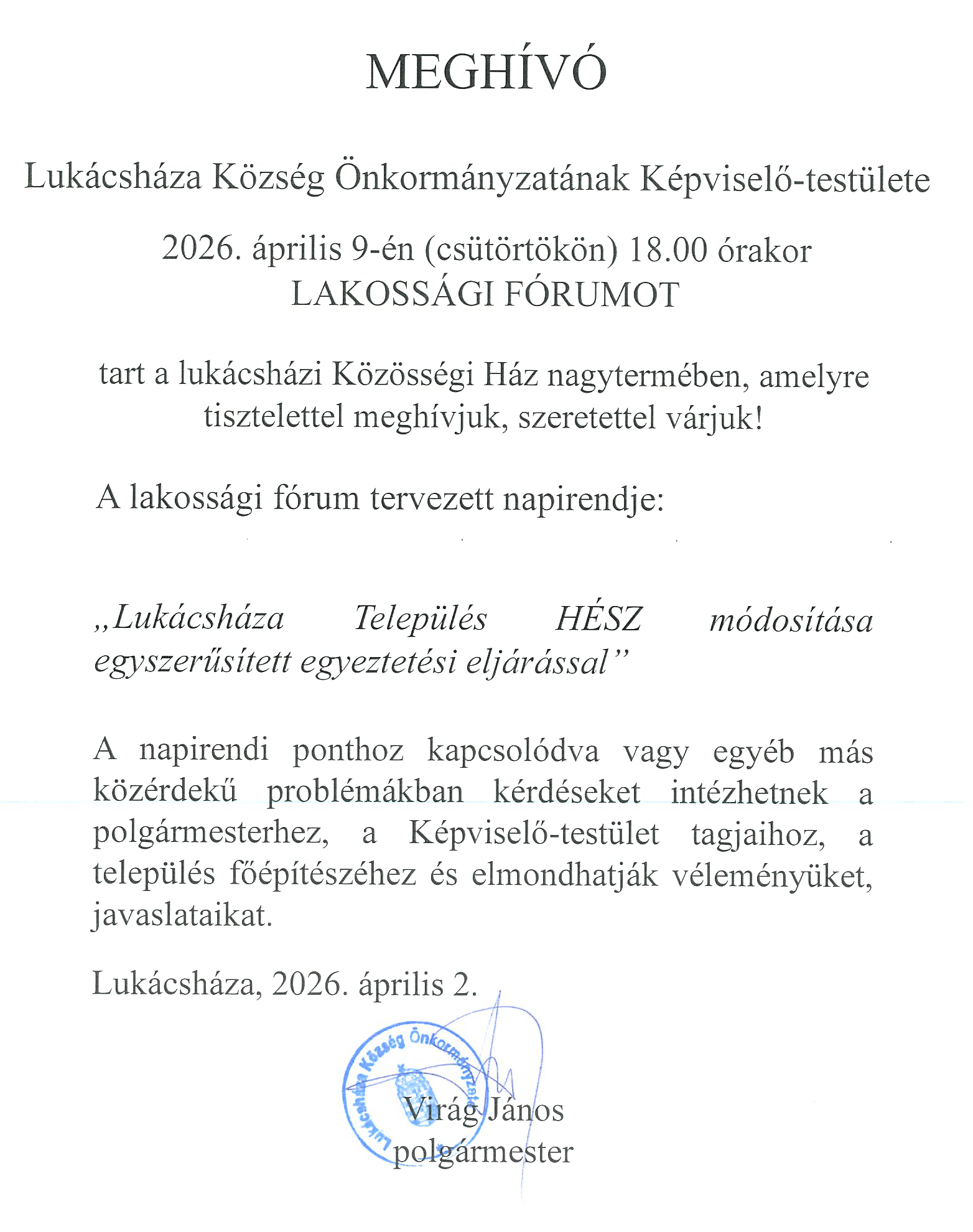 MEGHÍVÓ Lukácsháza Község Önkormányzatának Képviselő-testülete 2026. április 9-én (csütörtökön) 18.00 órakor LAKOSSÁGI FÓRUMOT tart a lukácsházi Közösségi Ház nagytermében, amelyre tisztelettel meghívjuk, szeretettel várjuk! A lakossági fórum tervezett napirendje: Lukácsháza Település HESZ módosítása egyszerűsített egyeztetési eljárással